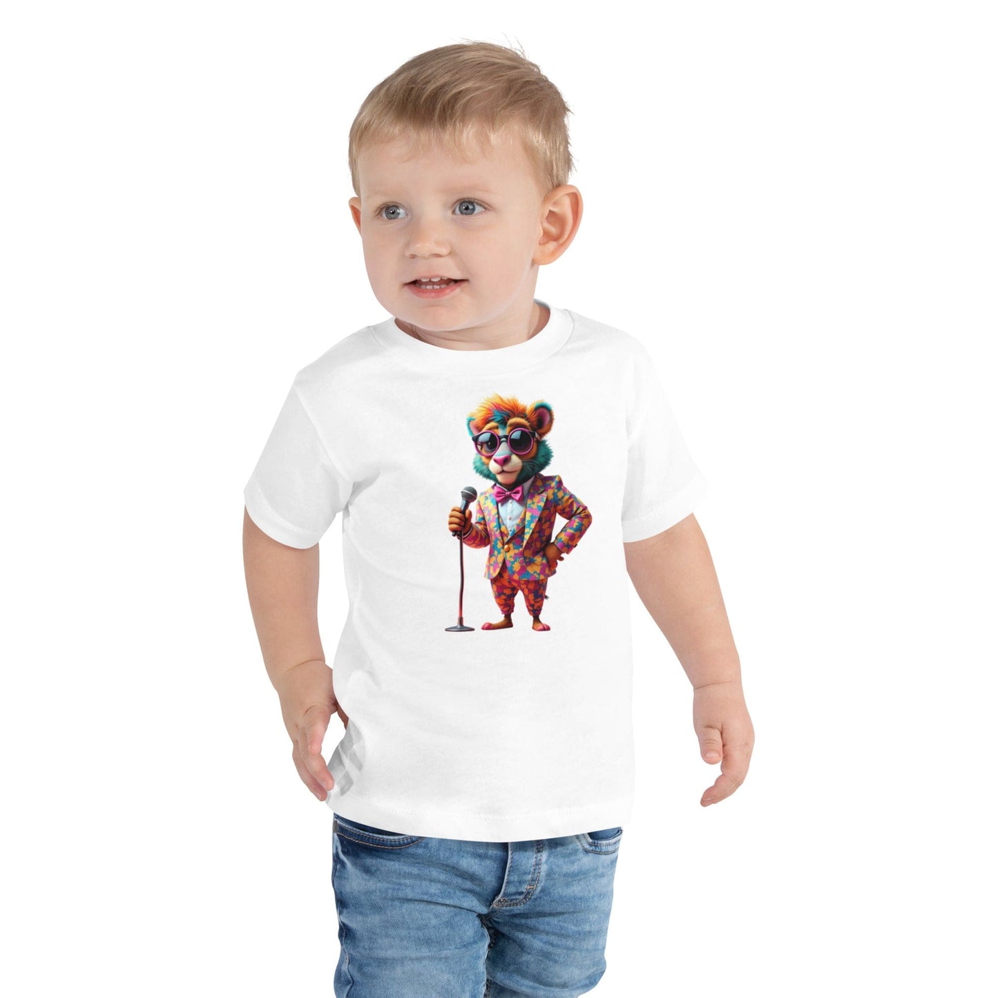 This bold toddler T-shirt stars a cartoon bear in a rainbow-patterned suit, bowtie, and sunglasses — holding a microphone like he’s headlining baby Coachella. It’s the ultimate mix of cool and quirky, perfect for tiny performers, party starters, or kids with loud personalities. Soft, durable cotton and serious character — exclusively from ccanvas.